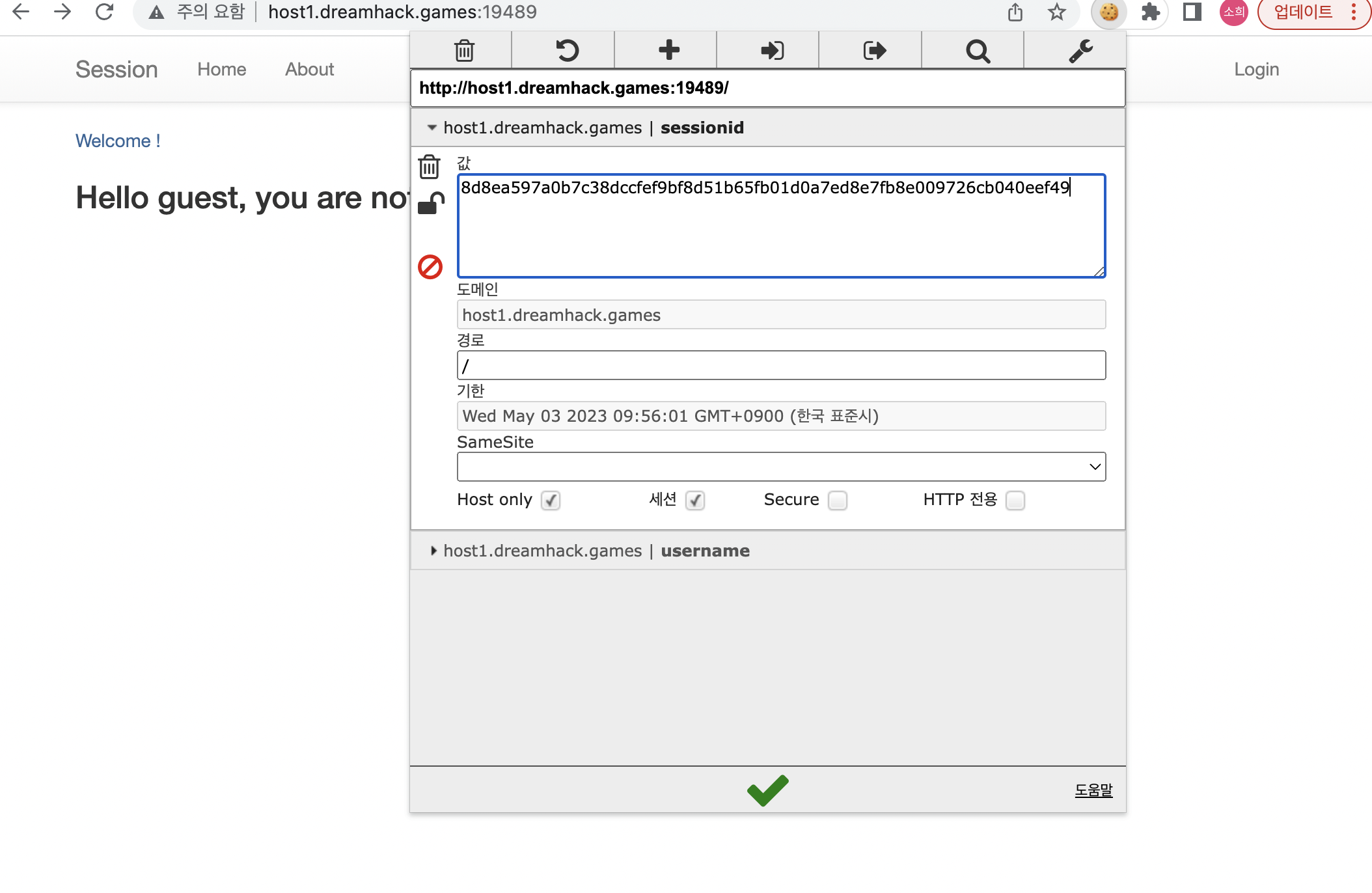 이우 /admin 에서 확인했던 값을 sessionid에 넣어줬습니다.