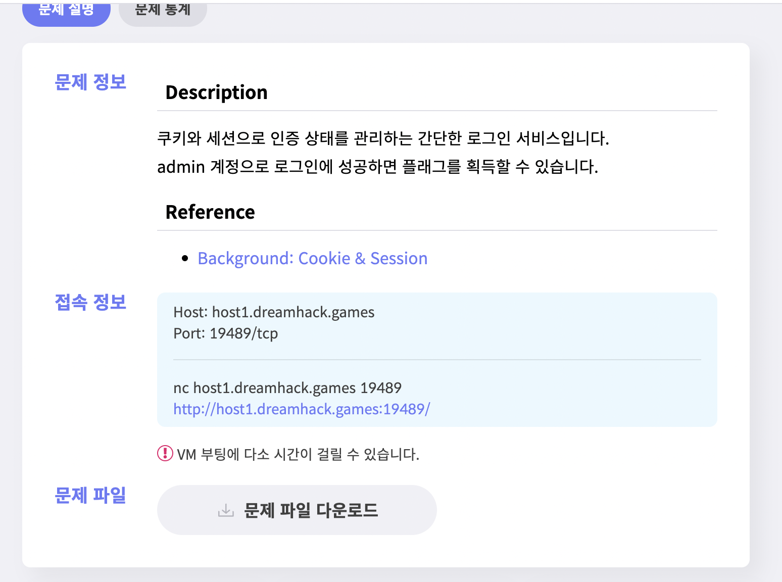 Dreamhack의 session-basic문제입니다. 쿠키와 세션으로 인증 상태를 관리하는 간단한 로그인 서비스입니다. admin 계정으로 로그인에 성공하면 플래그를 획득할 수 있습니다.