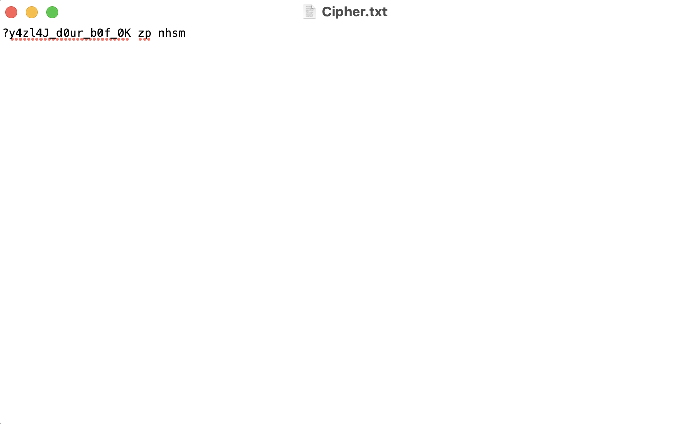 HackCTF의 Crypto분야의 Classic Cipher -1 문제입니다. 문제에서는 압축파일 하나가 주어집니다. 이 압축파일을 해제하면 아래와 같은 문자가 적힌 텍스트파일 하나가 나옵니다.