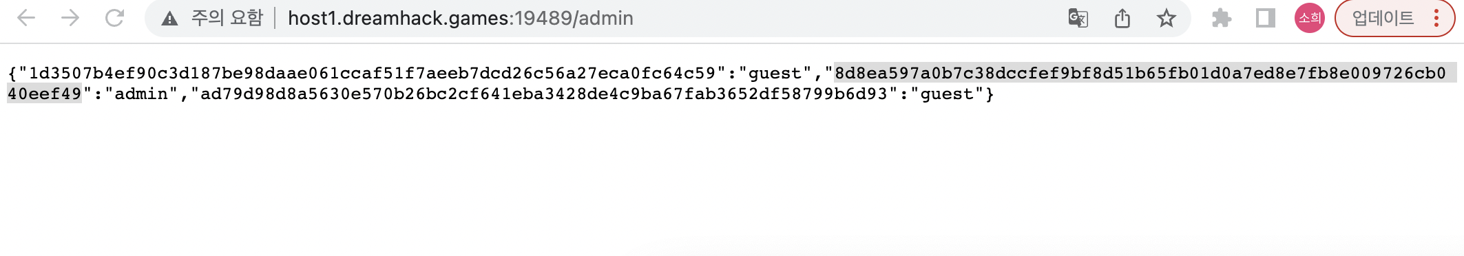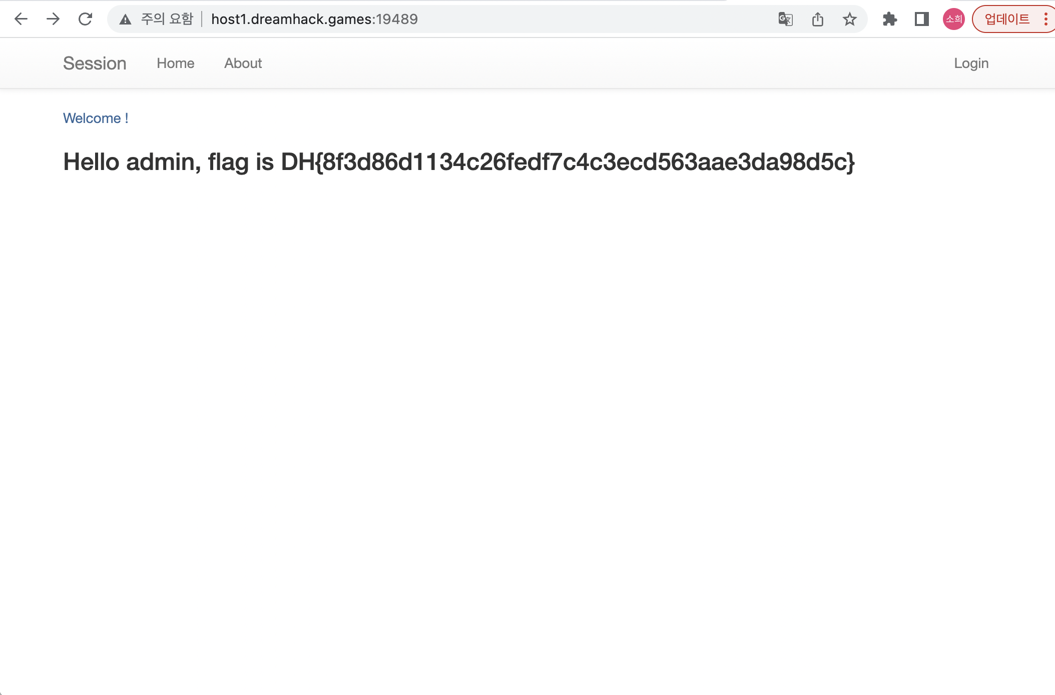 admin으로 로그인 시 flag를 획득할 수 있다는 것을 확인할 수 있었다.