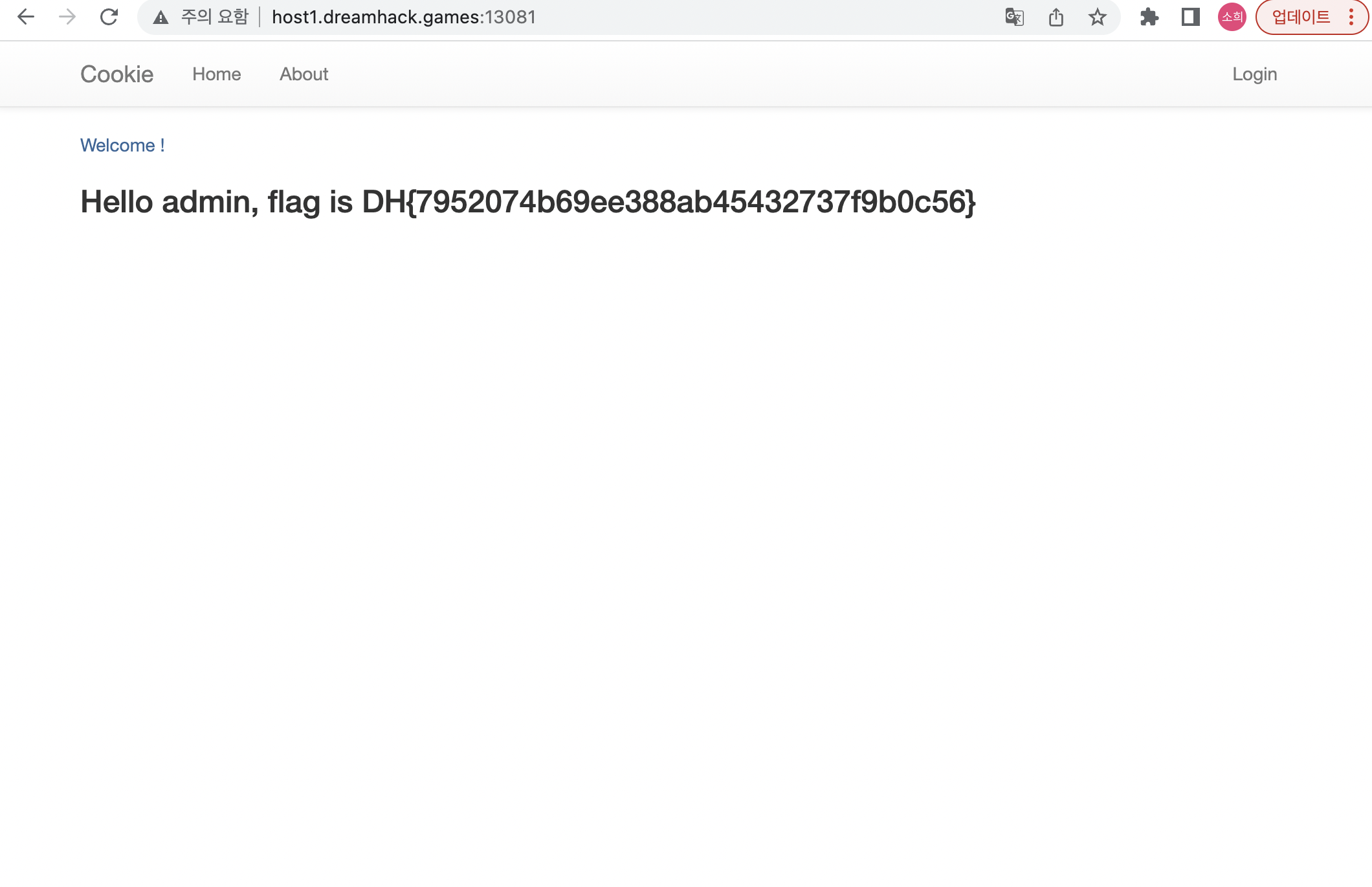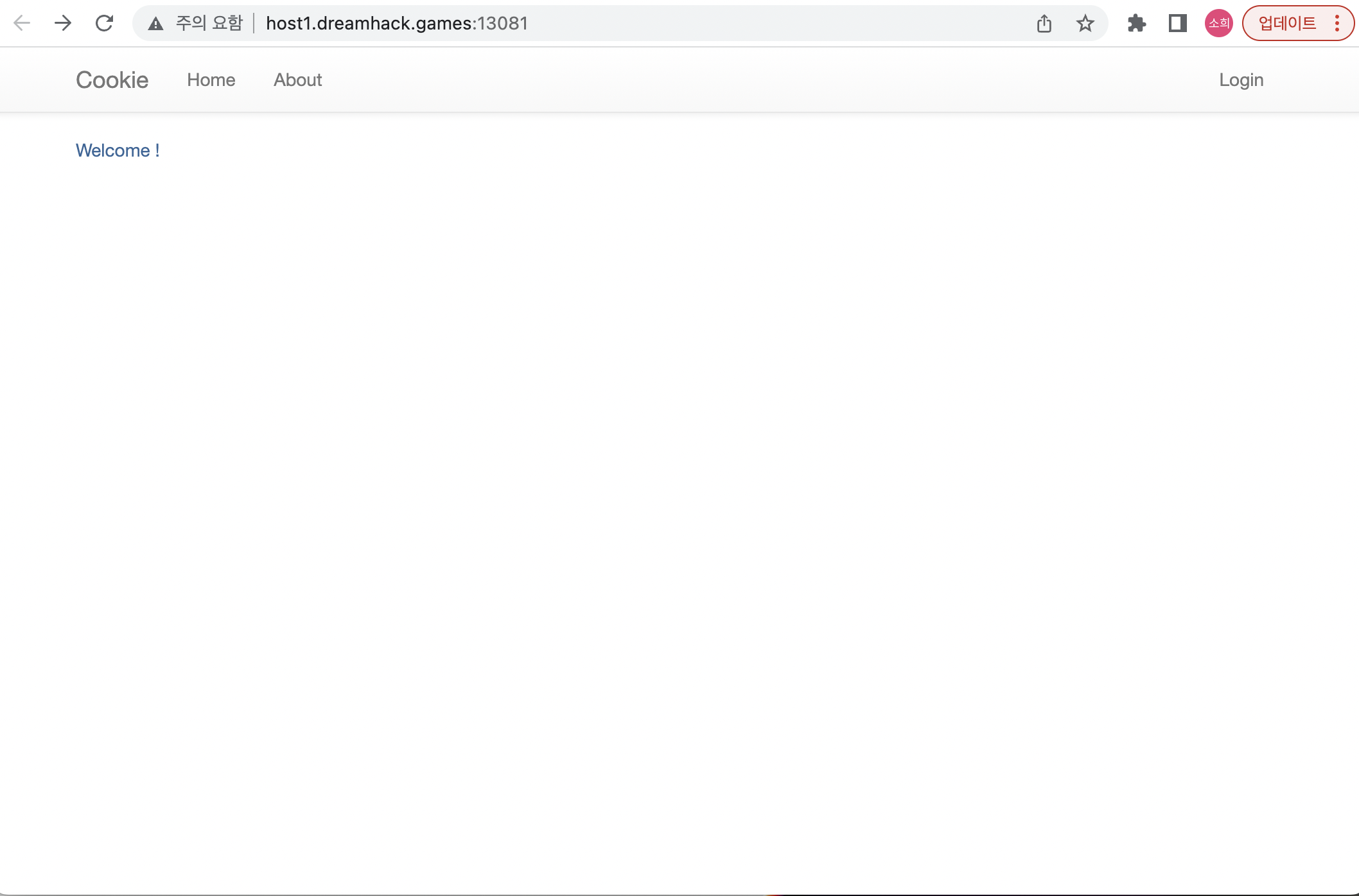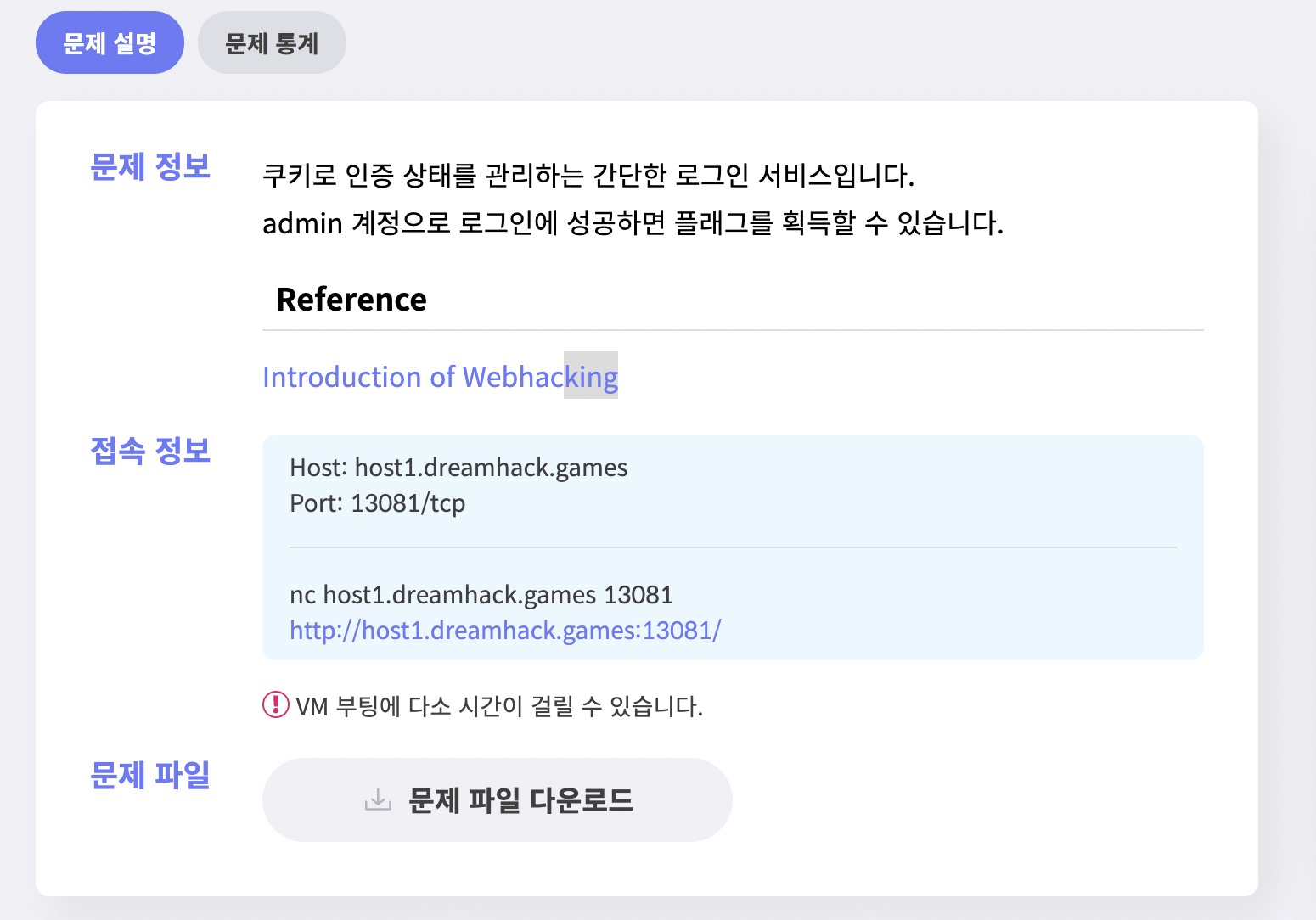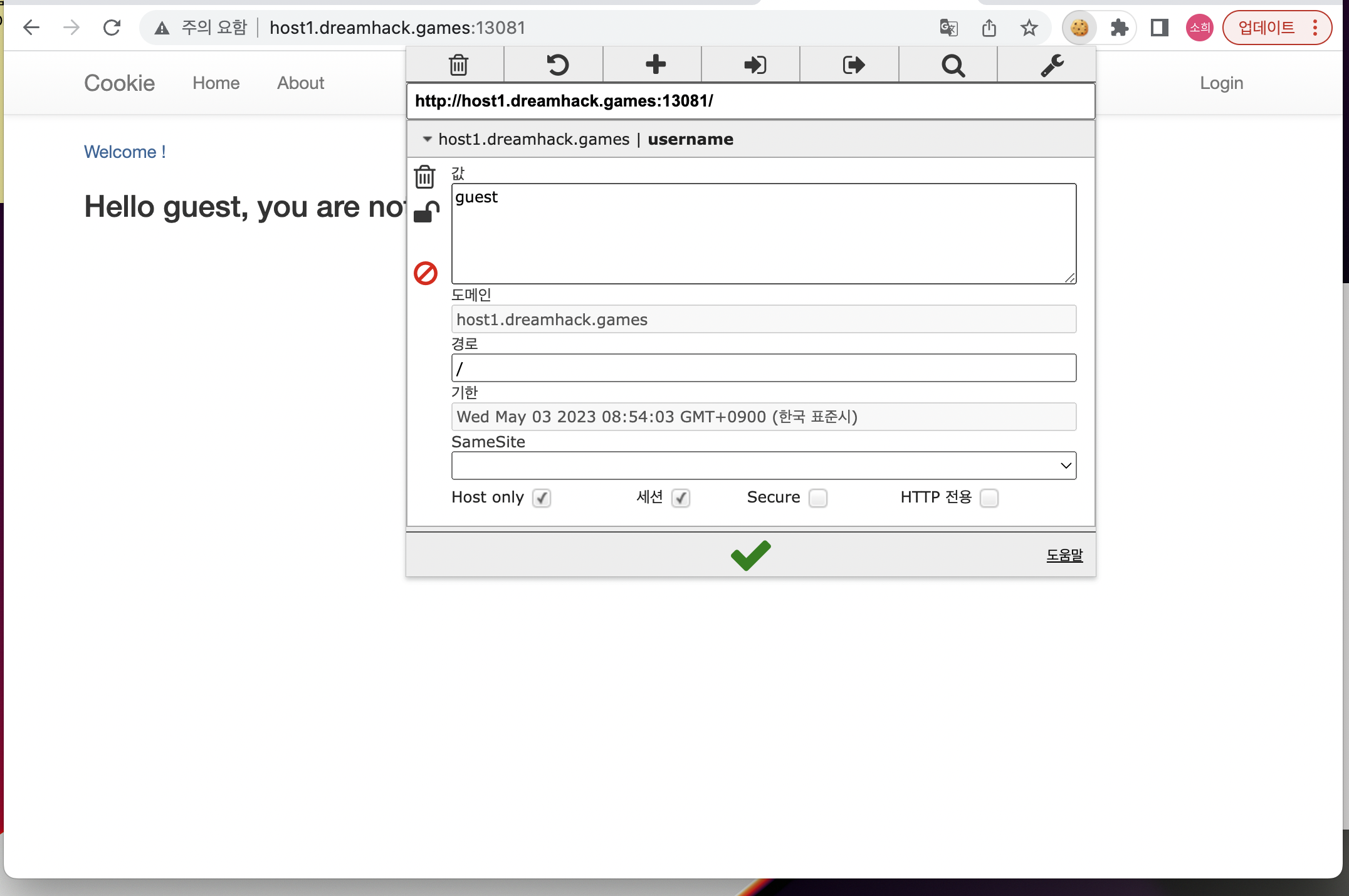 Dreamhack의 Cookie문제입니다. 이 문제는 admin계정으로 로그인을 하여 플레그를 획득할 수 있습니다. 문제에서는 쿠키로 인증 상태를 관리하는 로그인 서비스라는 것을 알려줬습니다.