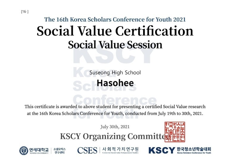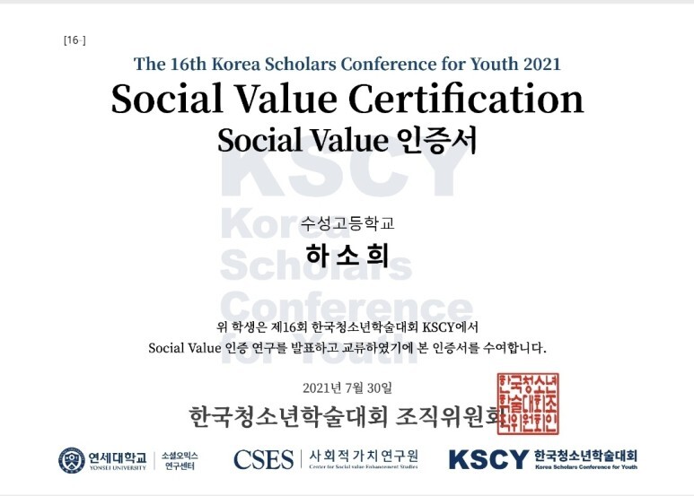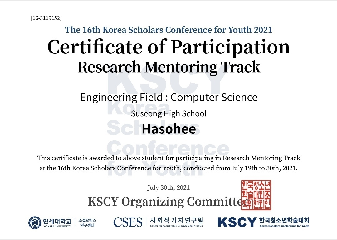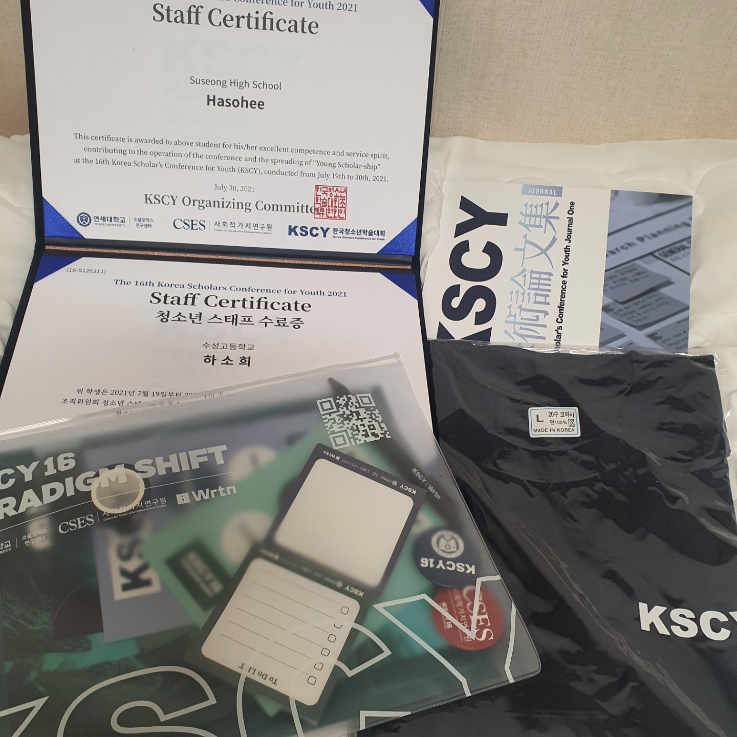 코로나19로 인해 온라인으로 진행된 KSCY16이 끝이 났습니다. SNS를 통하여 우연히 KSCY를 알게 되어 STAFF로 참여를 하게 되면서 많은 경험을 하게 된 것 같습니다. 처음 KSCY를 알게 되었을 때는 '학술대회'라는 것이 진입장벽이 매우 높아 보였습니다. 하지만 지원을 하여 KSCY16 STAFF로 활동을 하면서 생각했던 것보다 어렵거나 힘들지 않았고 피실리 에이터 분들도 굉장히 친절하고 재밌으셔서 활동을 흥미롭게 진행해 나갔던 거 같습니다. 처음 참여를 하는 활동이라 학술대회라는 것의 이해도를 높이고 싶어 STAFF로 참여를 해보았습니다. STAFF로 활동을 하며 많은 사람들에게 청소년도 자신의 연구논문을 발표할 수 있는 활동이 있다는 것을 알리고, STAFF 활동뿐만아니라 저도 관심이 있는 분야와 다양한 분야의 발표를 들으며 다양한 사람들과 의견을 공유하며 새로운 지식을 학습 할 수있었습니다. KSCY16은 여름 방학이라는 짧은 기간 동안 저를 한 층 더 성장시킬 수 있었던 흥미로운 활동이었습니다. 이 활동을 기반으로 저의 관심분야의 대한 연구 논문을 발표 할 수 있기를 바라며 학습하겠습니다.