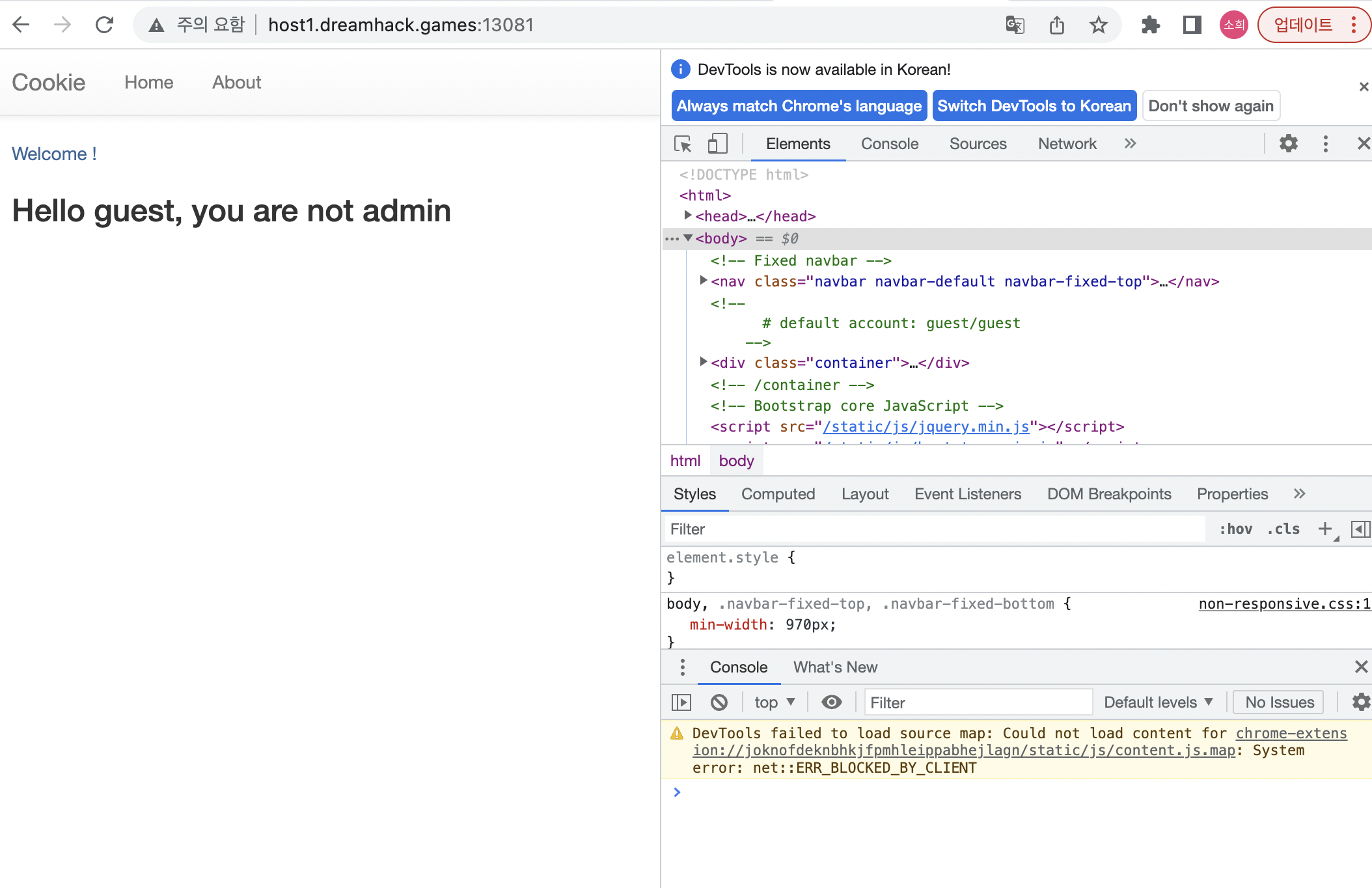 EditThisCookie를 활용하여 쿠키값을 확인해보니 guest인 것을 확인할 수 있었습니다. 이를 admin으로 수정해보았습니다.